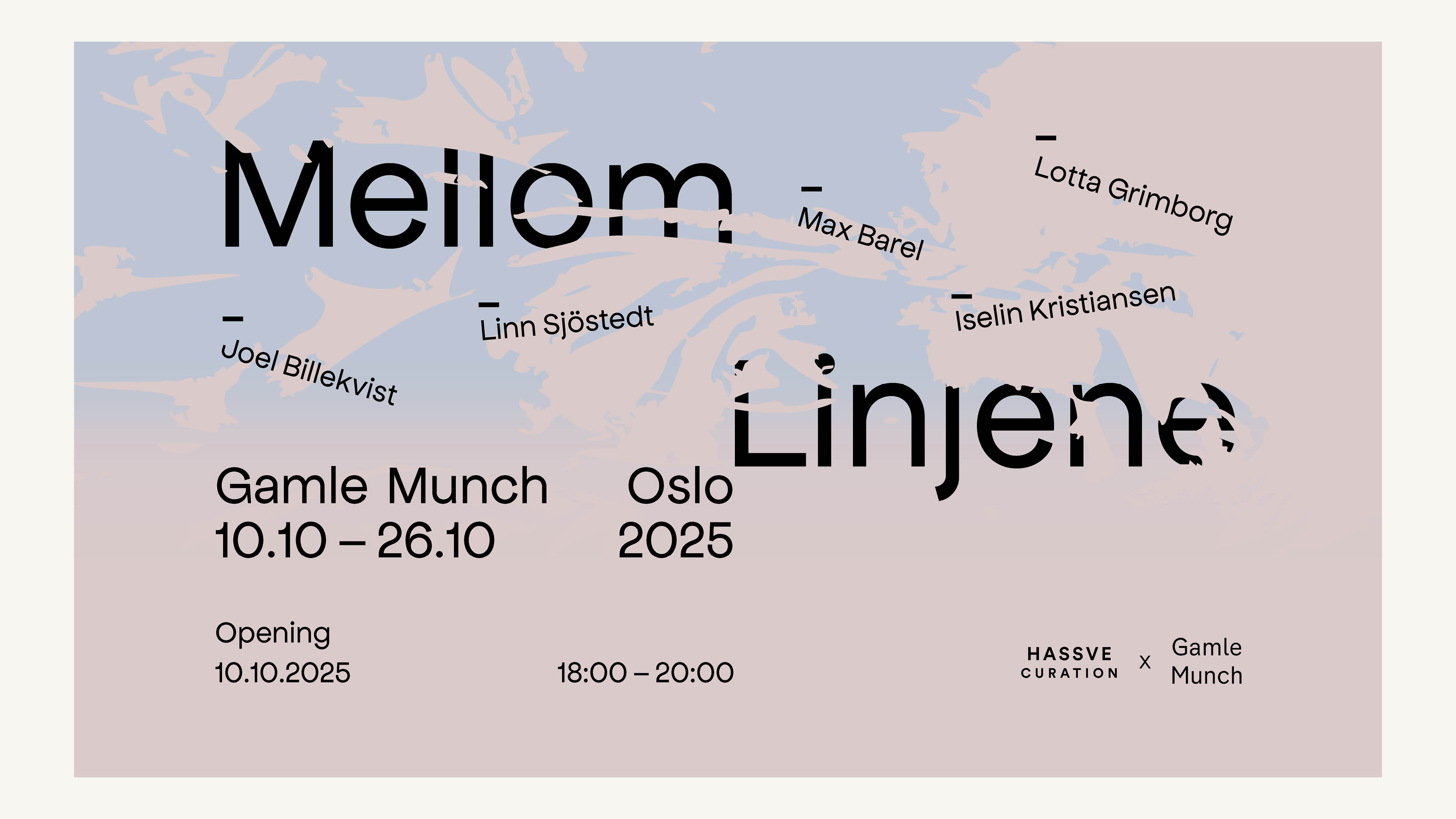 Mellom Linjene er en gruppeutstilling som samler kunstnere innen skulptur, maleri, fotografi og tekstilarbeid. Gjennom ulike visuelle tilnærminger belyser verkene materialitet, minimalisme og det uuttalte i kunsten.